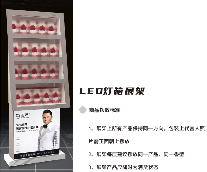不同品類的產品搭配不同的展示架,呈現出的陳列效果也各有不同,香百年根據產品特點,設計與之匹配的產品展架,確保產品能得以更美觀地呈現在消費者面前,從而加大對產品的宣傳作用。